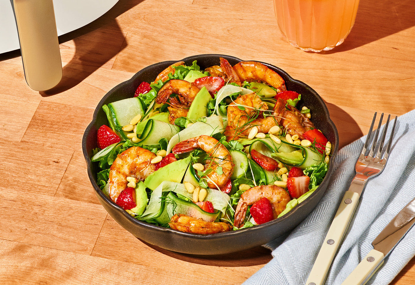 In a large serving bowl, layer the greens, avocado slices, strawberries, cucumber ribbons, and toasted pine nuts. Top with the warm air-fried shrimp.Drizzle & Serve: