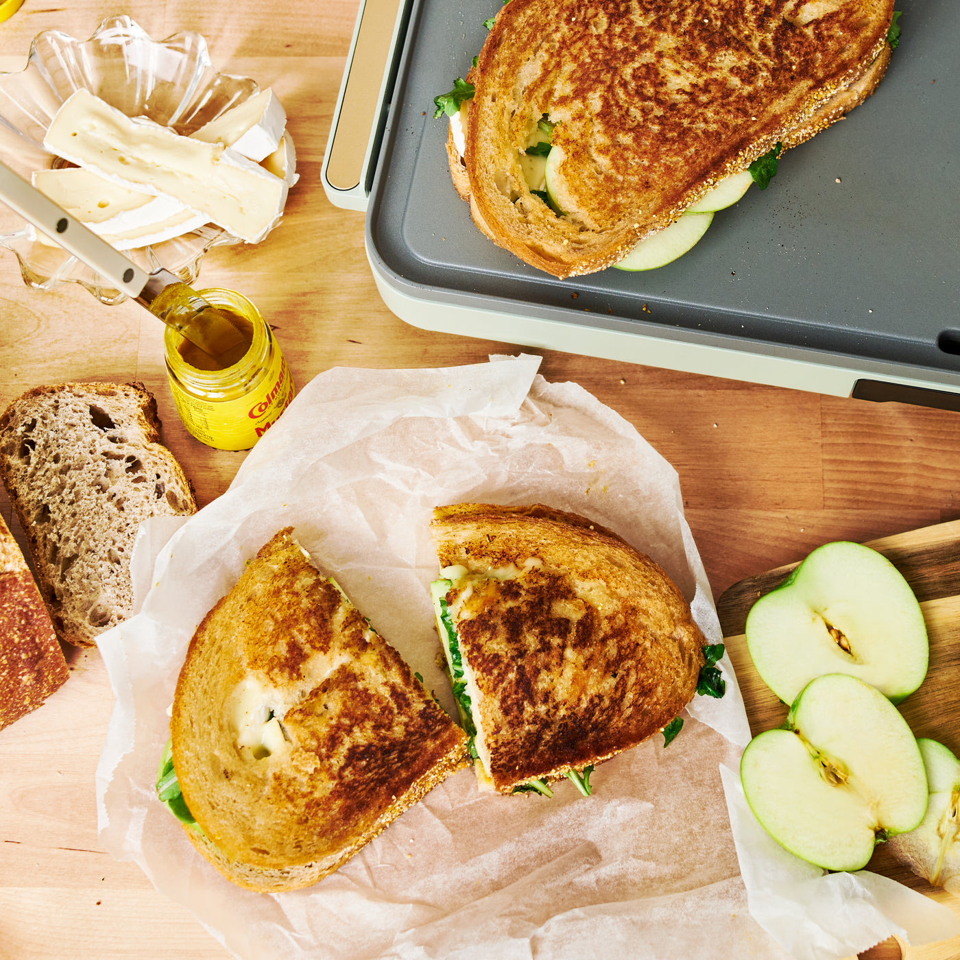 - Remove the rind from the Brie. Lay the Brie on top of the apple, spreading and flattening as you go. Add arugula and press to adhere. Close the sandwich so that both buttered sides are on the outside.