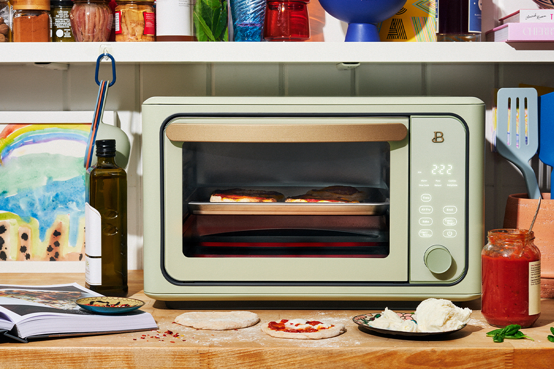 - Bake in the Beautiful Digital Air Fryer Toaster Oven until the edges of puffed and golden, cheese is melted, and sauce is bubbling. Top with fresh basil leaves before serving.
