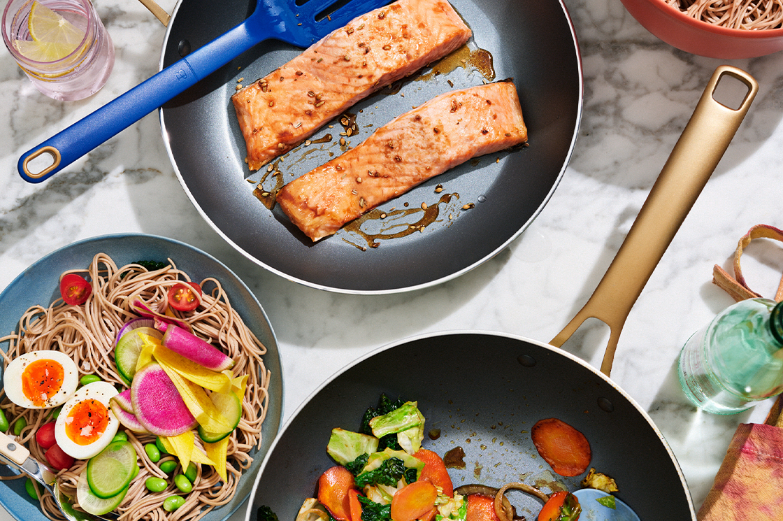 For serving: Divide soba noodles in separate bowls, top with flaked salmon, eggs, radishes, and serve with sesame-ginger dressing.